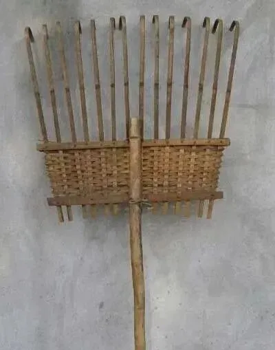 这个竹制的叫筢子,用来拢柴草和捡秸秆,外形像个扁扁的簸箕但齿更长,边沿编得紧实,山上拾柴的人站着一筢一筢把草拢好,回家堆在炕旁,烧锅用得上,那会儿家里取暖和做饭全靠它。.