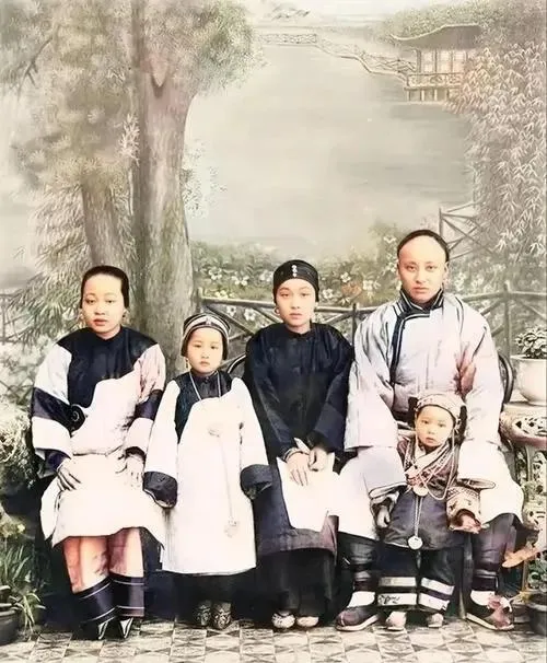 照片里这是一家五口,穿戴齐整,围着椅子坐一排,衣料绸缎纹理细腻,针脚掂手能看见,不过全家福上人的表情都拘着,特别是男人,脸上板得紧,女人两手交叉握在膝盖上,小孩站得笔直,能看得出来那会照相不是件随便的事,得全副精神头撑着,家里大事才会拍一张,环顾四周哪哪都规矩,笑一笑都得斟酌,家风写在脸上。