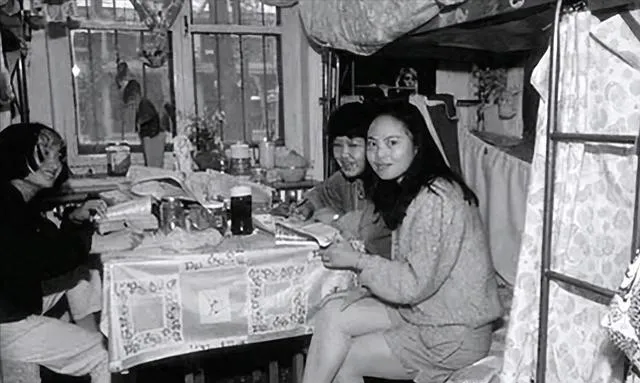 这张叫合住的屋子,桌上摆着简单的碗筷,床边堆着被褥,几个人围桌读书聊天,生活虽紧但凑在一块儿暖和, 我舅妈住过这样的宿舍,晚上大家挤着聊天,谁家做了好吃的就传着分,那个年代的靠近是常态。