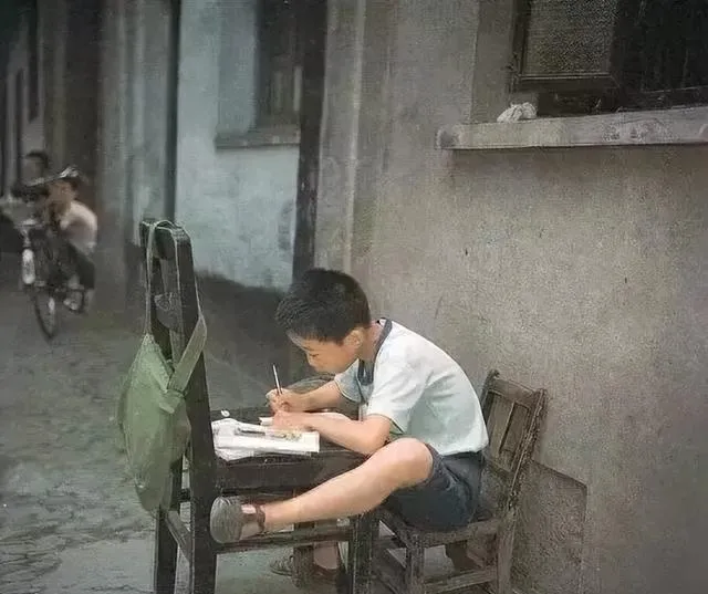 图中这个场景叫课桌外的读书角,门槛旁一张小板凳,一把旧椅,一个书包斜搭在椅背上,孩子把书摊开,腿一搭一边,写作业写得凑足劲,太阳照着墙面出点亮斑,旁边有人骑车经过叮当一声,那种专注像捞着什么珍宝,写字的手势整个儿就是年代感,小时候我也常在巷口这么坐着,邻居阿姨走过来喊你回家吃饭,你还盯着题不愿意走。