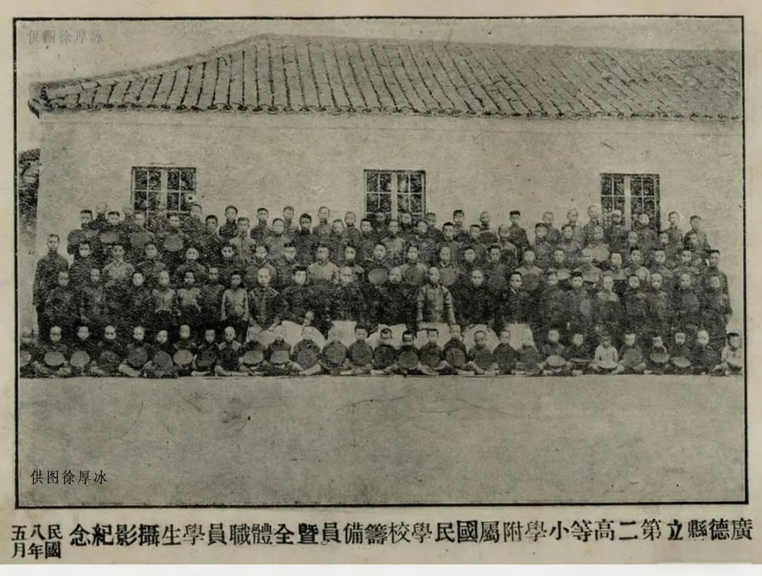 今发现的老相片,就是1919年广德县立第二高等小学筹备后、正式开学前,筹备人员及学生的合影。见下图: