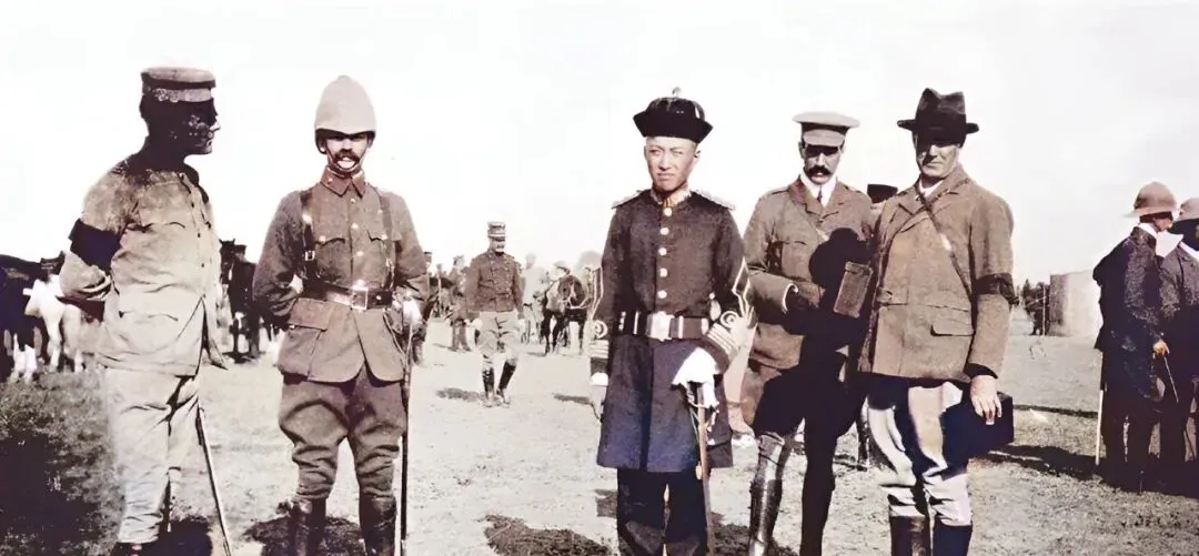 图里满地是人,前排几个穿军装的站得笔挺,有清军也有外国兵,帽子扣得严严实实,后排人影排成一条线,各种腰带、枪套、靴子,不用问那是陆军大演练的场面,正经的阵仗。