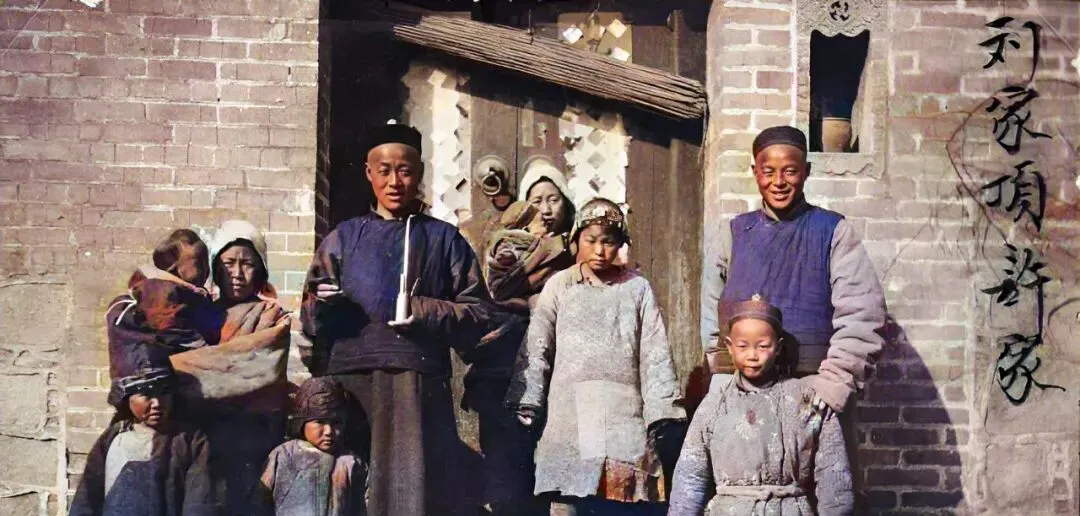 这一大家站门口的照片,别看人多,仔细一看大门上头还写着**“利家顶许家”四个字,砖砌的大门、木头横梁,还歪着挂了个破门帘,家里大人孩子一排排站着,有人手上还攥着旱烟壶,女眷们裹着土布褂子,小孩子顶着绵帽子,脸上挂着那点新鲜劲,看起来就有几分人丁兴旺**。