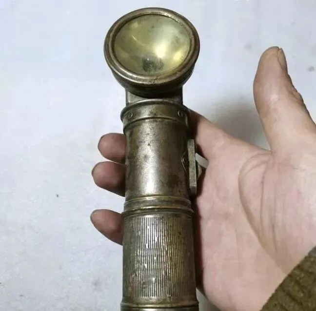 大哥大姐们, 这老式手电筒在当年可是个宝贝疙瘩, 这玩意黄铜做的, 拿手里沉甸甸的特有分量, 那时候晚上出门走夜路全靠它, 谁家要是有个这样的手电筒那可了不得, 现在都用LED手电了, 这玩意早就淘汰了, 可那时候拿着手电筒照路, 跟小伙伴们一起走夜路的胆子和乐趣, 现在的孩子是体会不到了。
