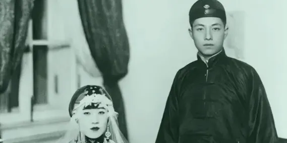 图上穿长衫的是林彪,那时候年纪轻轻,眉眼间透出一股俊俏和书卷气,站姿贼正,袖口和襟边熨得笔挺,旁边的姑娘穿着戏装,脸色雪白,眼睛泪汪汪的,一头珠翠耷拉着,咱小时候要是穿新衣去照相,爷爷总要喊一句“抬头挺胸,别笑傻了”,可不管怎么装,衣服再好神采是骗不了镜头的,像林彪这副少年模样,就一句,真是凭自个骨头里透的底气。