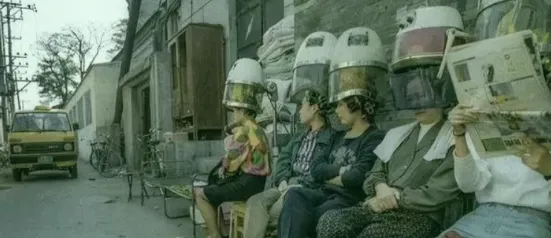 图里的阿姨们一人一个烫发罩,坐在墙根底下排排队,有人托腮,有人偷看身边的报纸,这阵子烫头就是大事,遇上下雨只好搬出屋子在巷子转角扎个地盘,街坊邻居谁不是来这聊家常,顺手给自己换个新形象,烫发机外壳白中带点黄,罩子下头烟雾缭绕的样子现在可见不着了。