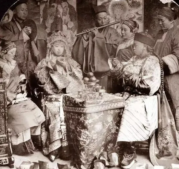 老照片:在中国举行的一场婚礼,新郎新娘十分年轻。