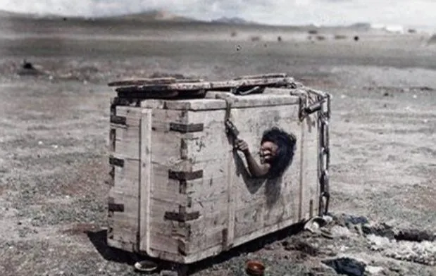 老照片:外蒙古乌兰巴托,一个受刑的妇女。法者常常把这种装有犯人的木箱放置在人烟稀少的大漠之中,任其自生自灭。