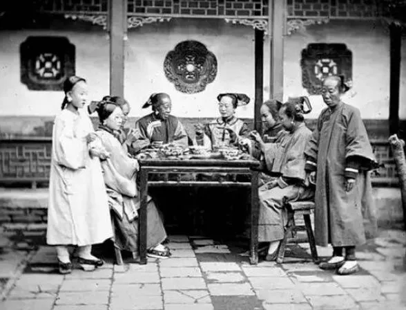 老照片:北京,正在用餐的满族妇女。照片中正在用餐的满族妇女吃的正欢,但站立的一老一小两个女仆人则面无表情。