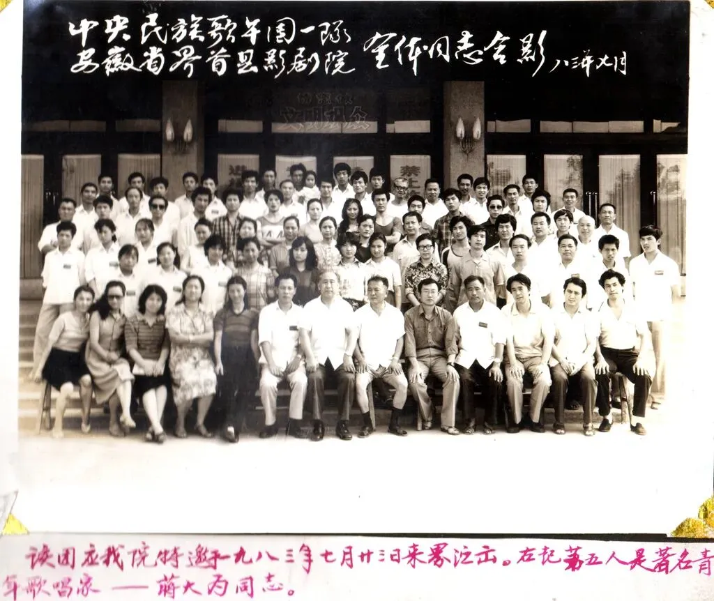 一九八三年七月二十三日,中央民族歌舞团一队、安徽省界首县影剧院全体同志合影。前排右5为蒋大为。