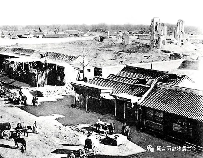 在义和团运动失败后,八国联军曾对战火后的北京城,用热气球进行了航拍。宣武门的南堂已经没有一个完整的模样。上图就是被义和团烧毁的宣武门南堂后的状况。