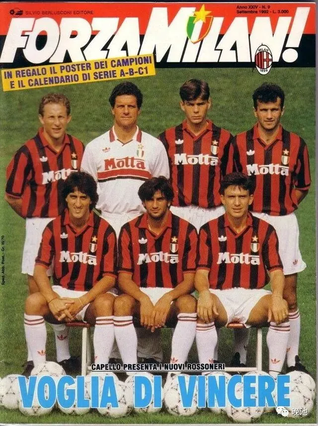 1992年9月的加油米兰杂志封面,AC米兰新人亮相,合影中有大长脸主帅卡佩罗和帕潘、博班、萨维切维奇、德纳波利、伦蒂尼、埃拉尼奥。
