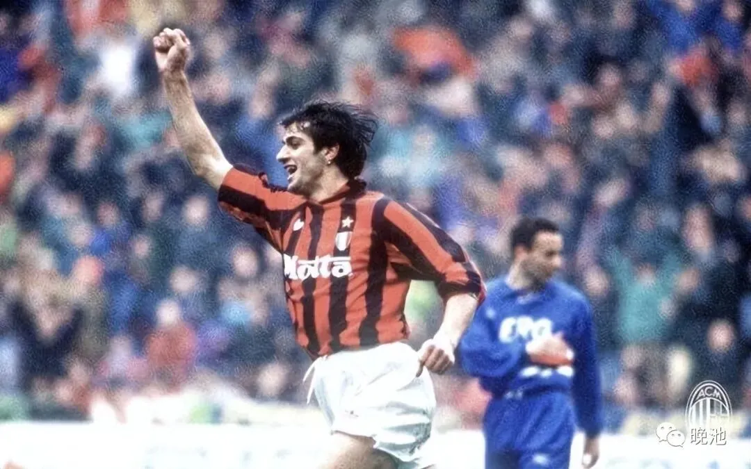 1993年2月28日,意甲第21轮比赛中,AC米兰4比0大胜桑普多利亚,伦蒂尼进球庆祝
