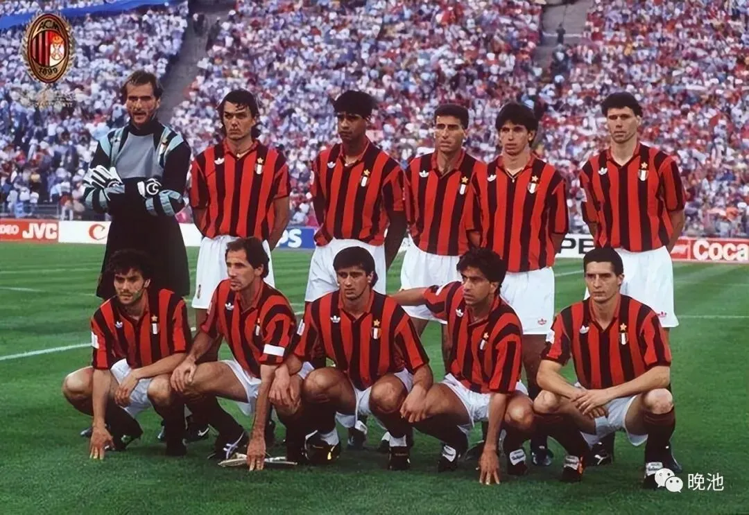1993年5月26日,欧冠决赛前米兰首发合影。依次为:罗西、马尔蒂尼、里杰卡尔德、塔索蒂、阿尔贝蒂尼、巴斯滕、多纳多尼、巴雷西、伦蒂尼、科斯塔库塔和马萨罗,可谓巨星云集!
