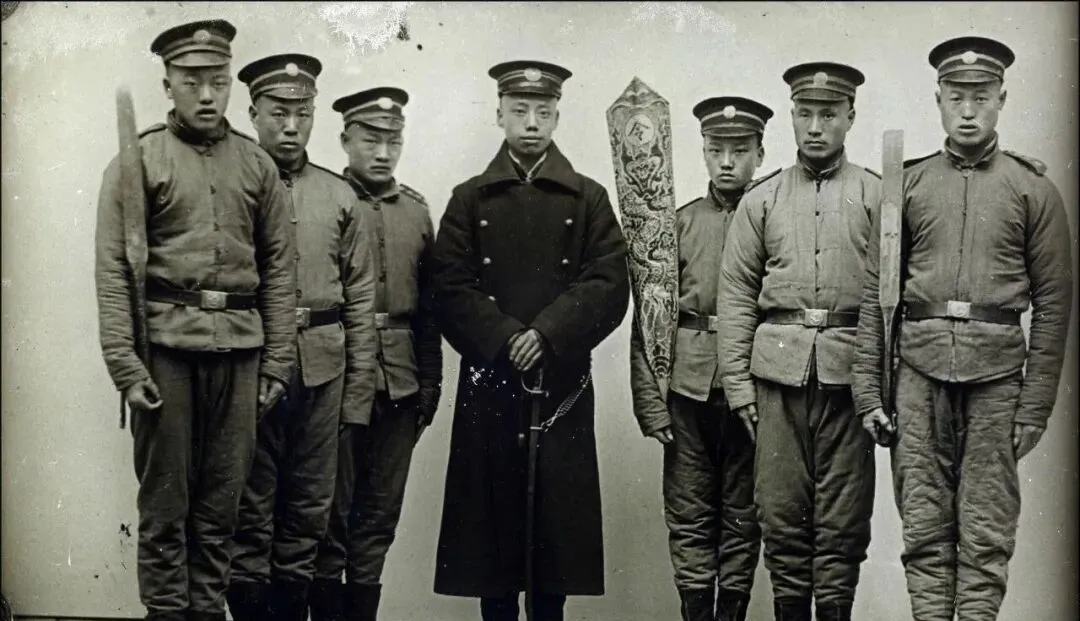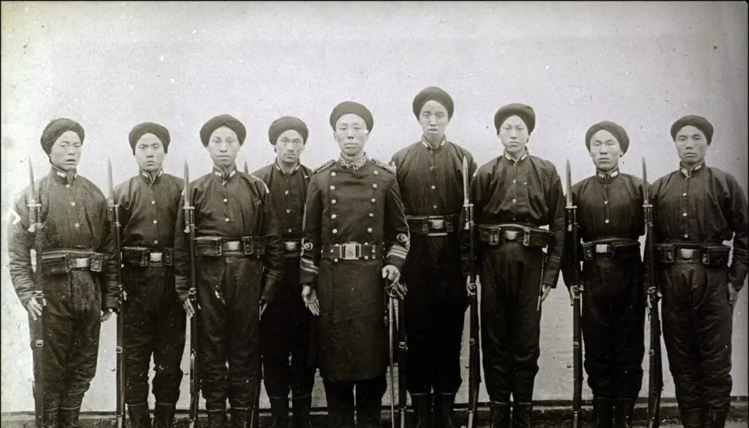 这组士兵外形特别扎眼,头上缠着黑布边,衣服一律深色,两边插步枪,腰上挂皮带,队长还穿着双排扣长大衣,外表看起来传统又带点洋气,这种混搭风格算清末独有,过去都是大清服制一水到底,新军出来之后,规矩全变了,哪怕是军帽,也贴着徽章,“那时候潮流就是这样生出来的”,家里人看照片也觉得稀罕。
