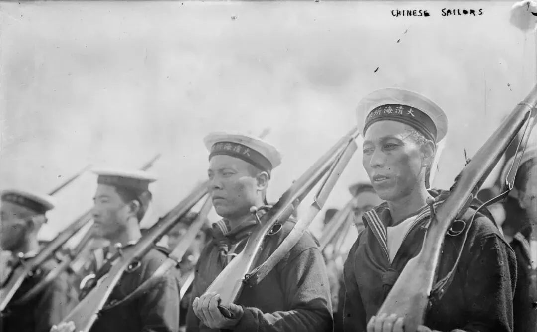 这个身穿水手衫,头顶白帽的队伍,是清末新军的水兵队,帽舌带子上印着楷字“大清海军”,这一身放今天都不算土,肩扛步枪,衣领翻着,迎风一站就是个标准“大片”气场,我小时候第一次见类似衣服,是在老电影里,结果我爸笑着说“那是咱自家老兵也穿过”,没想到一百多年前,咱们就玩上这花样了,现在想,清末的水兵穿得还真够潮。