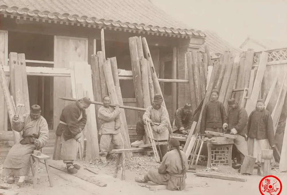 这群人在门口搭着架子干活,板子一根比一根宽,靠墙下成堆,图里靠右那俩人手上一根刨子、一把锯,腰间扎着布带,袄袖高高挽起,地上一层刨花,闻起来还有点木头香,小时候我爸总爱说,木匠都是自己琢磨吃饭本事,干这活腱子肉练得硬,拍板子声敲得院里都能听见,大活小活都得样样会,电视剧里演的师傅带徒弟,十有八九没体验过这满院子木屑的辛苦。