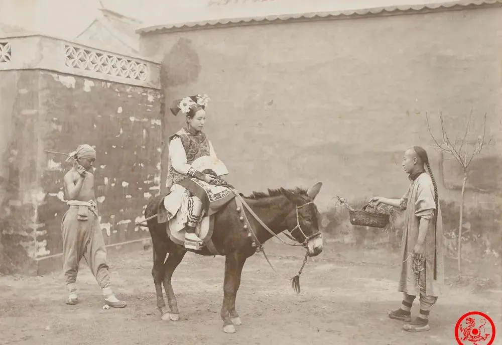 这画面最带劲,一姑娘打扮得妥妥帖帖坐在小毛驴背上,旁边围着赤膊小厮和一个提篮子的长袍男子,袍子袖口花边宽敞,发髻上翘得高高,表情有点随意像是看热闹,毛驴倒是站得端端正正,不慌不忙吃着东西,小时候见过邻居家有老照片,奶奶说那会儿镇上有钱人家出门不兴走路,一是讲面子,二是省脚劲,“谁让咱那时穷,骑牛驴都算神气”。
