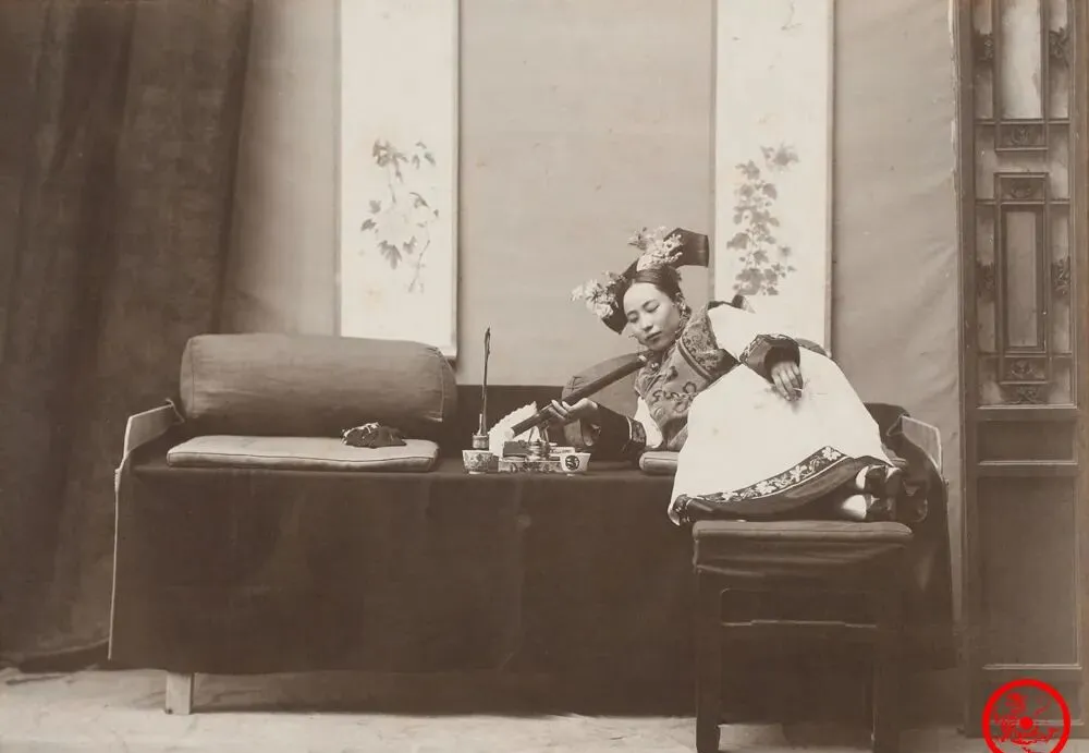 这个靠在长榻上伸着胳膊吞云吐雾的姑娘,姿态松松垮垮,衣服花样绕脖转,手指夹着长烟枪,身下垫着软垫,看着比一般人家过得精细,爷爷翻出来一本旧杂志,指着类似照片说,清末那点享受事儿没少败在鸦片上,“进了烟馆人就魂都散了”,电视剧还喜欢演大宅门熬夜煨汤,其实大宅里真闹得最凶的,是烟膏子和麻将声。