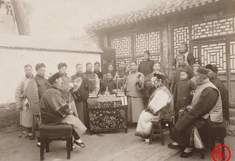 一堆人围着案子坐,正经八百的三弦、板鼓、钹一起开弦,有人端坐听曲,神态迷糊里还透着享受,门口站的几个小孩子伸着脖等着瞅得清楚点,桌上摆着酒壶和点心盒,气氛挺热闹,我家那阵子有亲戚请艺人到家唱折子戏,外头都是大雪,屋里围满听戏的,三四口子台下坐得比台上还兴奋,以前哪有那么多收音机电视,全靠人唱活气氛,谁家能请演出都算体面了。