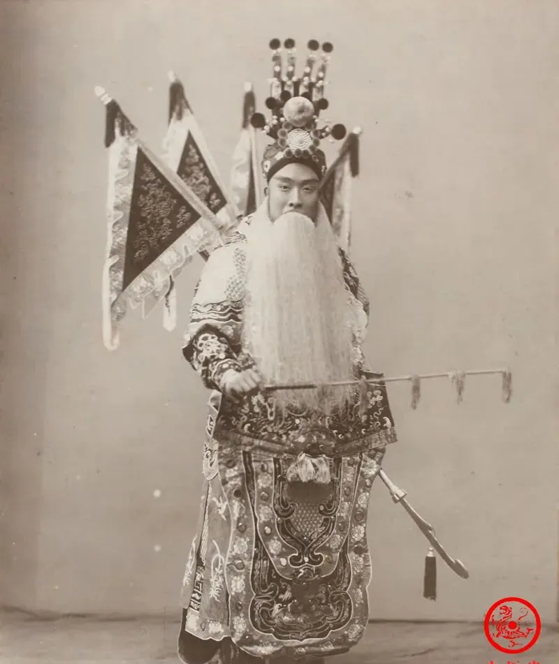 这个打扮花哨的角儿,盔甲翎子胡子一应俱全,身上锦绣滚边、裙帘一兜三层,手拿马鞭,脸上的神色更带劲,被这么一瞪大伙都喊“这是老生里的铁板桥”,以前老剧迷瞅到这样的台风都夸一句“底气够足”,过了这么多年,这些台下拍出来的戏服照片都比现在化妆直播有嚼头。