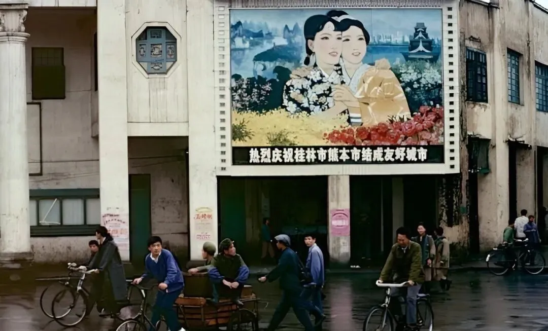 这块宣传牌高高挂在路口,上头两位姑娘笑得亮堂,底下骑自行车的全穿蓝褂子,皮鞋脚蹬三轮,小孩坐车斗里伸脖子扒着看人,八十年代的街头其实很简单,谁也不嫌脏不嫌破,反倒觉得日子结实,爸说那时候人和人的距离没卡壳,照片里留下的全是实打实的生活印子。