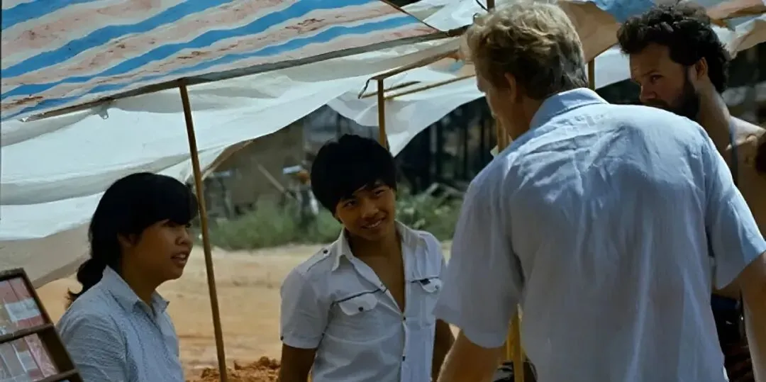 这一段就算开了眼界,图里本地女孩摊前,外国游客一过来,大家全是新鲜劲,有不会说的就手比划,明信片翻过来翻过去,有的小孩围着看热闹,妈妈隔空提醒别乱窜,做生意干脆利索,这里头是两个世界,但一点不别扭,每个人都找到了位置。