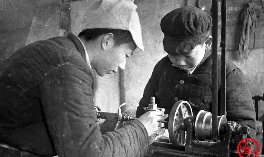 手艺这玩意儿,隔着年代都能透出来,这张里机器简陋得很,一个人低头紧盯着,手在调整零件,边上那位小伙子也不分神,机械工程系学生上实践课,全凭手头那两件家伙,磨一把刀,装个零件,眼神全飘不到别处,老师说一句解释,大家就伸长脖子蹭过去琢磨下,没有空调没有灯,风吹开篷布就自己缝一下,没条件就硬扛,也没听谁叫苦。