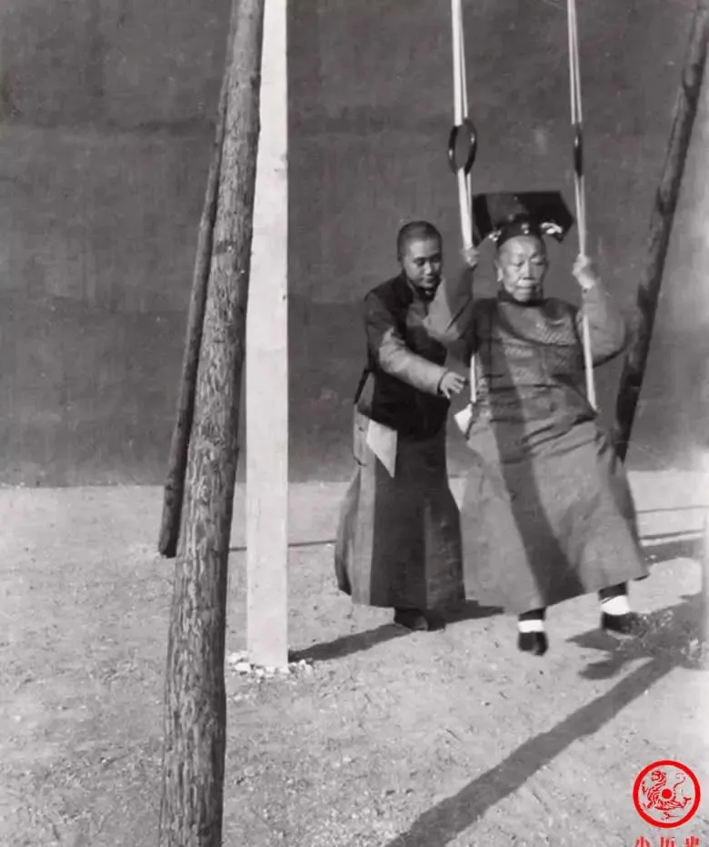 这一幕有意思,照片里,穿着整齐的老宫女竟还有闲心荡秋千,旁边有人推着,宫里头严肃归严肃,碰上有点风,有点闲工夫,年头久的老人家也能找点乐子转转,听我奶奶说,侍奉过太后、妃子那种主子的宫女,都有一两段自己的故事,宫里上下叠着数不清的恩怨,外人只当茶余饭后的笑谈。