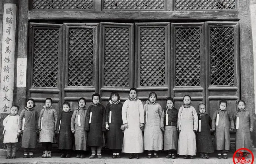 选秀女在戏里常常拍得气派,这张是真的挑选宫女,一溜儿小姑娘前胸挂着木牌,写着哪旗哪家姑娘,等候差事,谁被相中就留下教规矩,没中挑的打道回府,也有直接给王府或当大户使女的,命运转个弯哪边都不容易,这场面整个紫禁城一年才见几回,旗人姑娘心里头早就有点数。