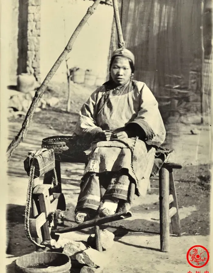 图里这位,是个地道的老手,她旁边那台木头家伙叫纺车,结实的木架子支在院子里,底下土还潮着,脚踩的踏板早都被踩亮了,边上放俩竹篮子,一头麻线别人怕打结,她手腕子一抡就顺,眼里不带事,织布人都这样,专心干活谁搭理你说话,以前屋里女人都学这个,桌子一清,纺线能干到天黑,现在织布都是大机器,再没人自己打麻绳了。