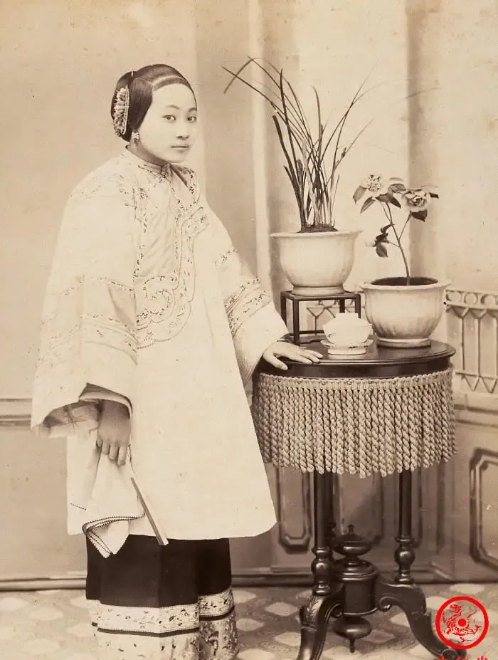 这个姑娘一身讲究,外头罩着绣花大褂,衣领袖口全是细细的针线活,头上还别着花簪子,细看下巴往前探了一点,脸上搁不下什么笑意,这年代的照片都这样,拍照稀罕事,拍的时候一紧张,人就僵住了,哪像现在手机一拿天天“咔嚓”,妈妈看见直夸那衣服料子厚实,老话讲“不是一般家庭舍得置办”,要真让她穿上,肯定走路都带风。