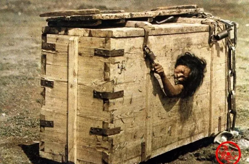 图里最扎眼的,得数这一只大木箱,四方正正糙木拼出来,一根根铁链死死箍着,边角都是厚重的铁脚,箱子下头落在地上,里头的人只能伸个脑袋和胳膊出来往外够,神情是拧着的,带着那种快到极限的劲头,谁看了都得皱一回眉头,说不清心里什么滋味。