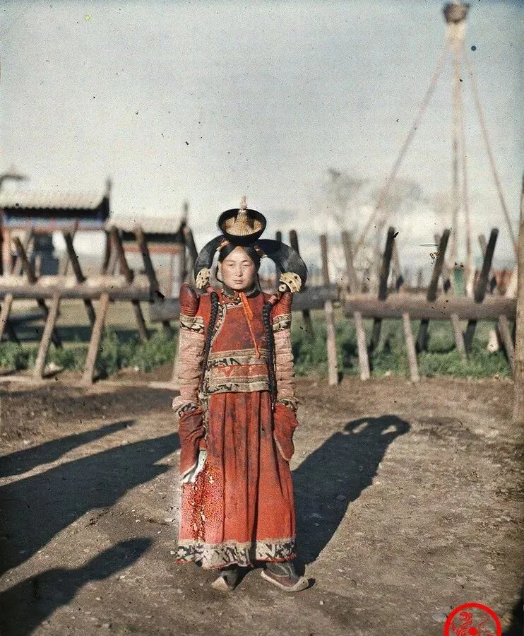这个镜头落在一位已婚蒙古妇女身上,身上套着一身大红长袍,层层叠叠紧紧贴着人,袖口裤脚满打满算全是花样,尤其那头饰,吃重得很,两边如牛角弯起,正中又顶着一圈黑色圆帽,远些看着像戴了顶盔甲,上下都压着份量。