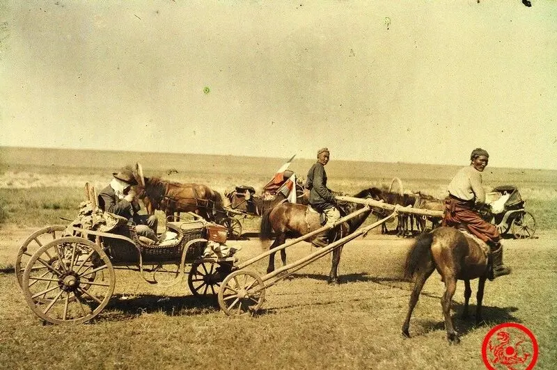 图里的三两架马车,车身都是编织的筐子套在木架上,大轮子嘎吱一转,人的屁股刚好能卡住,前头拉车的是枣红黑白的马,真有种远道赶路的意思,车上坐着穿长服的人,头上戴着窄檐帽,嘴边像还叼着根烟,车旁有的骑马跟着,后头一队队绵延不断。