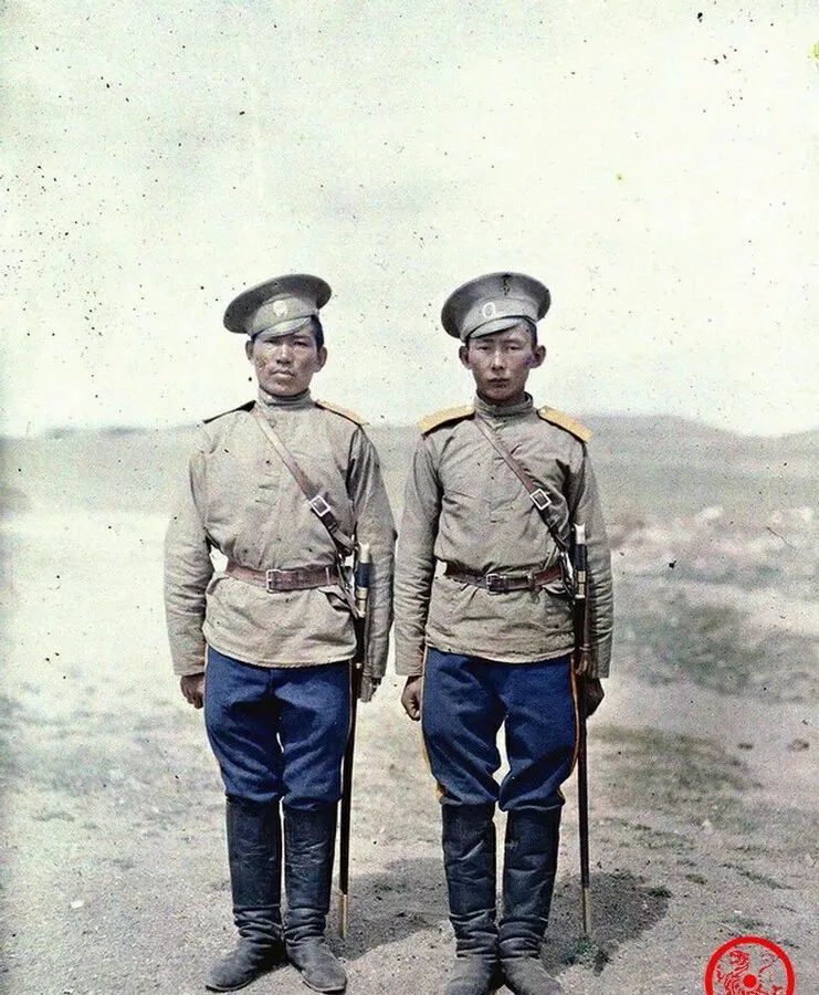 这一对立正站着的年轻人,穿着杂色军服,帽子上带光边,肩膀压着枪带,那衣服看着跟俄国士兵的式样沾点边,裤脚包着绑带,靴子整齐踏实,脸孔还带着一种稚气和严肃混在一起。