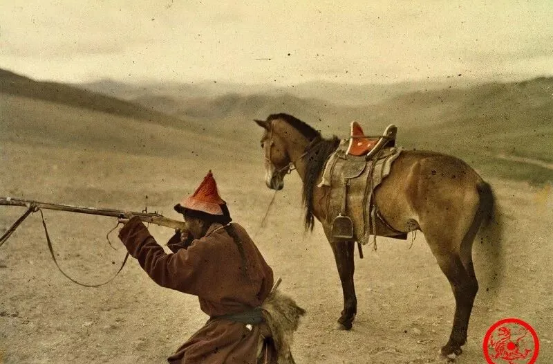 这一张是库伦附近的猎人,人蹲在地上,头上帽子红得挺扎眼,双手端着铁枪,眼睛和枪口都盯着远处,旁边的马站定不动,马鞍和枪杆子都磨得起了毛边。其实猎人在这里不是常事,大部分人还是靠牛羊活着,打猎是为了解解馋,真靠这个过日子的,没几个。