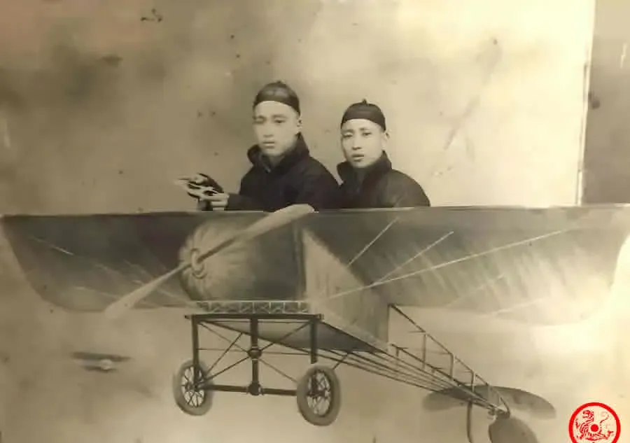 这幅照片就新鲜了,两位小伙子坐飞机合影,还是画出来的“新鲜洋气”,画布上一架飞机,支起轮子,机身带翅,少年坐在里头,衣裳还是清末那套官帽马褂,但手里一握,俨然要开飞机去了,照相馆把这个当招牌,谁要敢来照一张,回去都够嘚瑟半辈,爷爷说有年头的人第一次看到气球飞机都快傻眼,觉得能飞天的是神仙,那种看热闹的心劲儿,和现在小孩玩VR差不多,不嫌假,就要个新鲜。