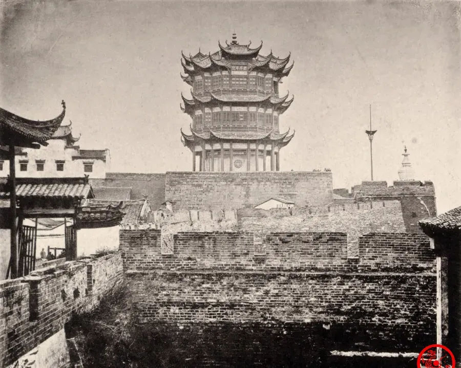 照片里高高矗着的便是刚新起来的黄鹤楼,那层楼一层压一层,屋顶翘角勾着云,看着压得住场子,砖墙包着楼身,还是带点新鲜劲儿,外墙纹饰眉清目秀,没经历过风刀霜剑,和现在蛇山上那一座比,地方和气象差多了,小时候家里长辈总喜欢念“昔人已乘黄鹤去”,去武昌游玩就得指着这座楼讲古,那种城头新楼的干净气,人一看就记住不是随便一堆木头砖瓦。