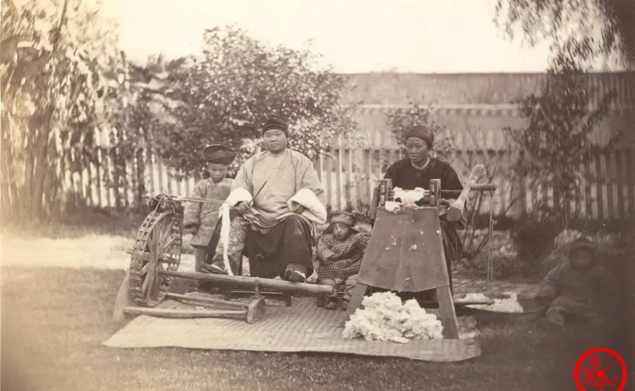 图里的那一套叫纺线架和弹棉弓,一堆女人小孩围在一块,左边的大纺车转起来咯吱带劲,打棉弓的姑娘手上净是灰,孩子们一边喊一边玩,妈妈说以前家里全靠这个自给自足,一针一线全自己织出来,不像现在卖场里随手一挑,过去布满是苦过的手汗。