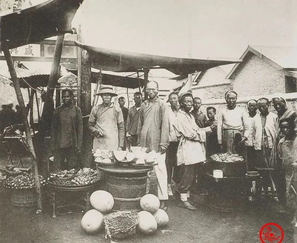 图中这一摊子,巷口两根木杆子撑着布棚,下面什么水果堆成堆,西瓜滚在摊前,那个时代的北京人,吃个大西瓜都得扫一眼,兜里有闲钱的人才会切一块消暑,瓜摊后的汉子穿着粗布大褂,有个戴草帽的,还带着点南方人的劲头,后头一堆围观的,谁家孩子嘴馋挪不动脚步了,小时候我妈说那年头能吃上一口鲜瓜,叫一整个夏天都觉得解渴。