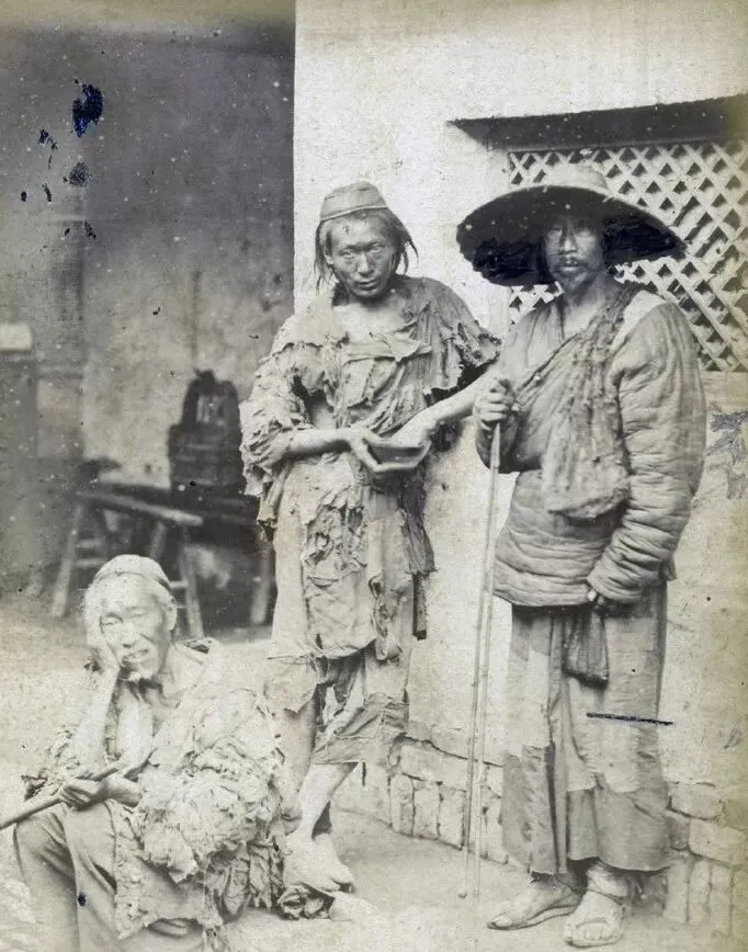 这几个人身上的衣裳,全是破布头一层一层缠出来,乍一看还以为是麻袋片子,靠在墙角抽着水烟袋的老头,两眼迷迷糊糊的,旁边一个站着的女人托着手,另一人歪着身子杵着棍儿,脚上只剩半拉鞋底,走一路掉半道儿边,那个年月,街上要饭的人不少,有人随手塞两枚铜钱,更多的是顾不上回头看一眼,爷爷说那会儿天还没亮就有敲门要饭的,手里碗一晃,瓷片叮当响,进了饭点饿得没劲,随手捡个馒头渣儿也算得着救命。