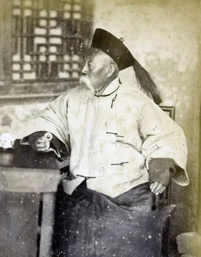 图里这位穿着官服、头上戴着帽翎,随手夹着个烟杆子,样子端端正正地坐着,袖口里露出来玉扳指,那会儿当官的不光讲究衣服料子,下手门道也不少,爷爷说他小时候见过一次巡街的县老爷,一身官服走在前头,后头跟着两仆人,手上也是这样一个玉扳指,一路不说话,却什么气势都有,那时候官和百姓隔着十条街,衣裳一穿出来就瞧得出身份,现在谁还认这些啊。