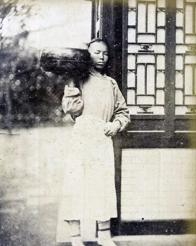 这个小姑娘是家里头的仆役,那时候跟着大户人家做事,扛着水缸、端着盆子,院子里来回穿梭,衣服是浅色的长衫,脚上绑着裹脚布,神情里既拘谨又有点打怵,奶奶说,那会儿干这些活得早起,冬天打水手都红裂了,小姑娘眼里有点怯生生,也是怕做不好事惹了主人责骂,忙得团团转还不敢停。