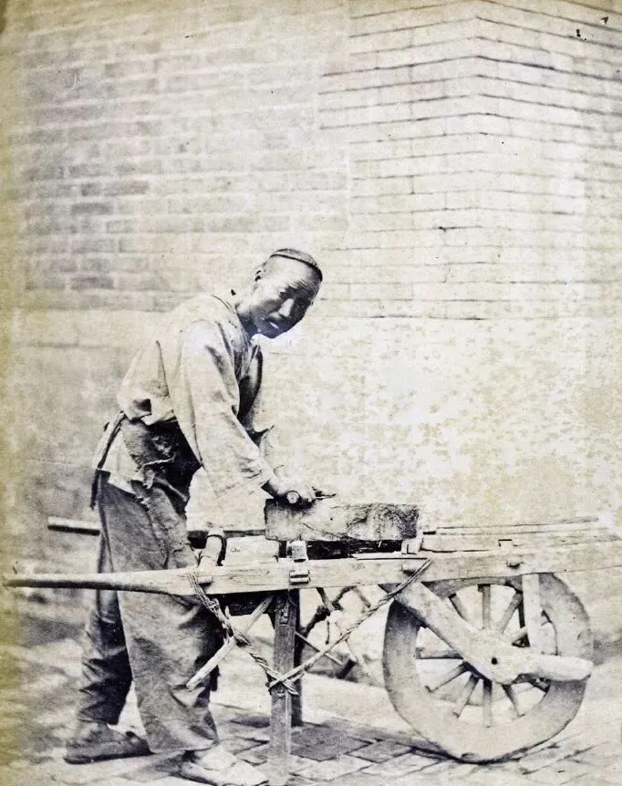 这个推着架子走街串巷的叫磨刀人,架子一停,木轮子咯吱咯吱响,案板上一块破石头,刀一搁上,“嚓嚓”地来回蹭,小孩们就站着围一圈看,磨刀匠算是老北京城里流动的风景,妈妈小时候说过,谁家菜刀剁手骨钝了,这人一来全家人都得围着叫好,磨一回能用大半年,那阵子家家都不舍得随便请,全靠这手艺撑下去,现在磨刀匠的身影早就见不着了,铁皮刀一断就直接扔。