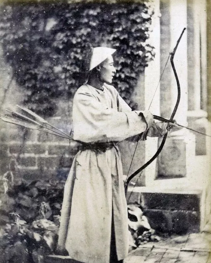 图里的这位小伙子,腰上挂着箭袋,手里拉着弓,一身戎服白裤摆到地,脸侧过去神情紧绷,那会儿的兵还全靠弓箭武艺,练扎马步的时候一身泥一身汗,爸爸说兵营边上总能听见拉弓扯弦的响动,弓软箭硬全练手劲,走到现在,谁家孩子还能玩把弓箭呢。