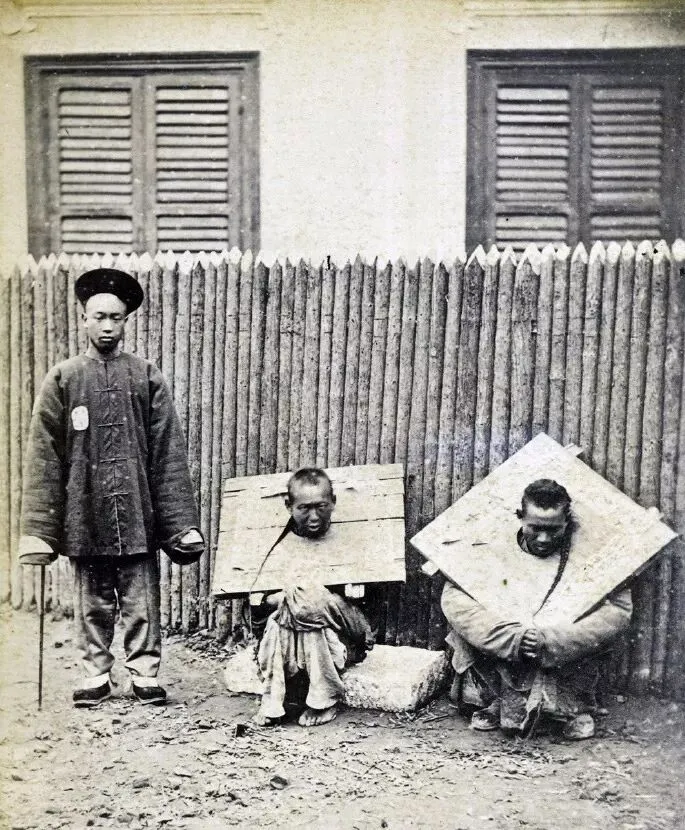 这张照片里一个穿长衫的捕快,两名囚犯脖子上套着重重的木枷,蹲在地上眼神灰蒙蒙的,那玩意一戴人立马矮半头,半天都不能转脖,还不敢随便动弹,妈妈说,老上海小巷里这种画面有时候一看就让小孩心里咯噔一下,现在警察办案,哪里还能见着木枷了,时代变了,连惩戒的法子都打不过去。