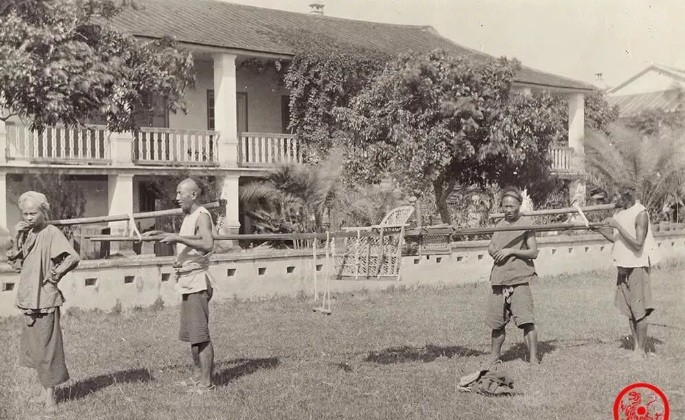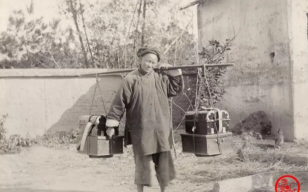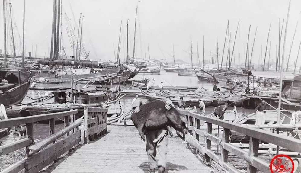 图中这挑担子走路的家伙,是码头边最常见的搬运工,扛在肩上的扁担腌得油光透亮,两边挂的箱子黑压压的,铁搭扣加绳网,装的什么也许是老板的货,也许就是给人搬家的行当,身上的粗布大褂有点肥大,就是为了“干活宽松”实用,鞋子底厚能抗,一天能走成千上百步,肩膀磨出老茧子,不是谁都熬得住。
