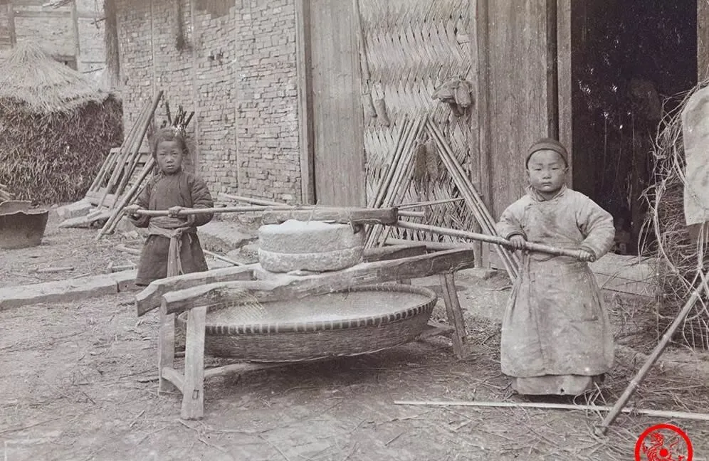 图中的这一对磨面石盘,小时候见过的都忘不掉,两个小孩使劲推着横木杆子,后面是一只大瓦盆接下面粉,石磨转一圈,手就麻一阵,这家伙白天看着不起眼,磨盘一转磨得唏哩哗啦,就是全家的吃食来源,别看小孩力气小,一点都不能偷懒,