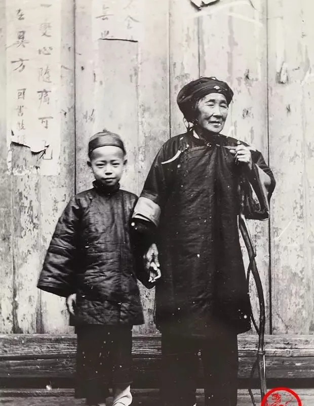 这张照片,老妇人一手牵着小男孩,另一手还攥着竹拐杖,斑驳的墙根背后,是吃尽世事的背脊,孩子瞪着大眼,站得板正,衣裳洗得泛白但干净,看这阵仗,八成是祖孙两代,村里常说,长辈带小辈,既能看人心也看时间,